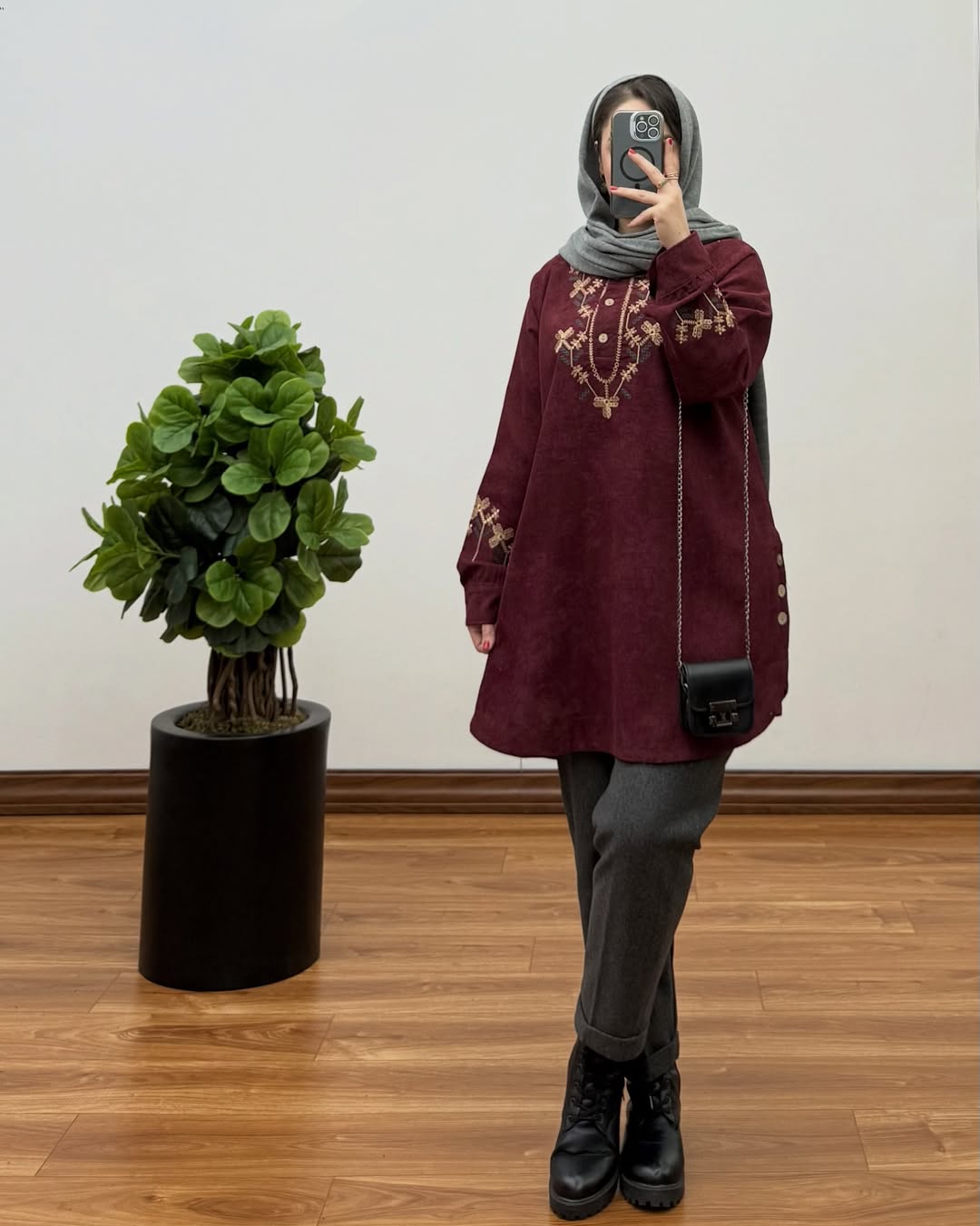 پیراهن مانتویی زنانه مخمل کبریتی طرح گلدوزی گندم