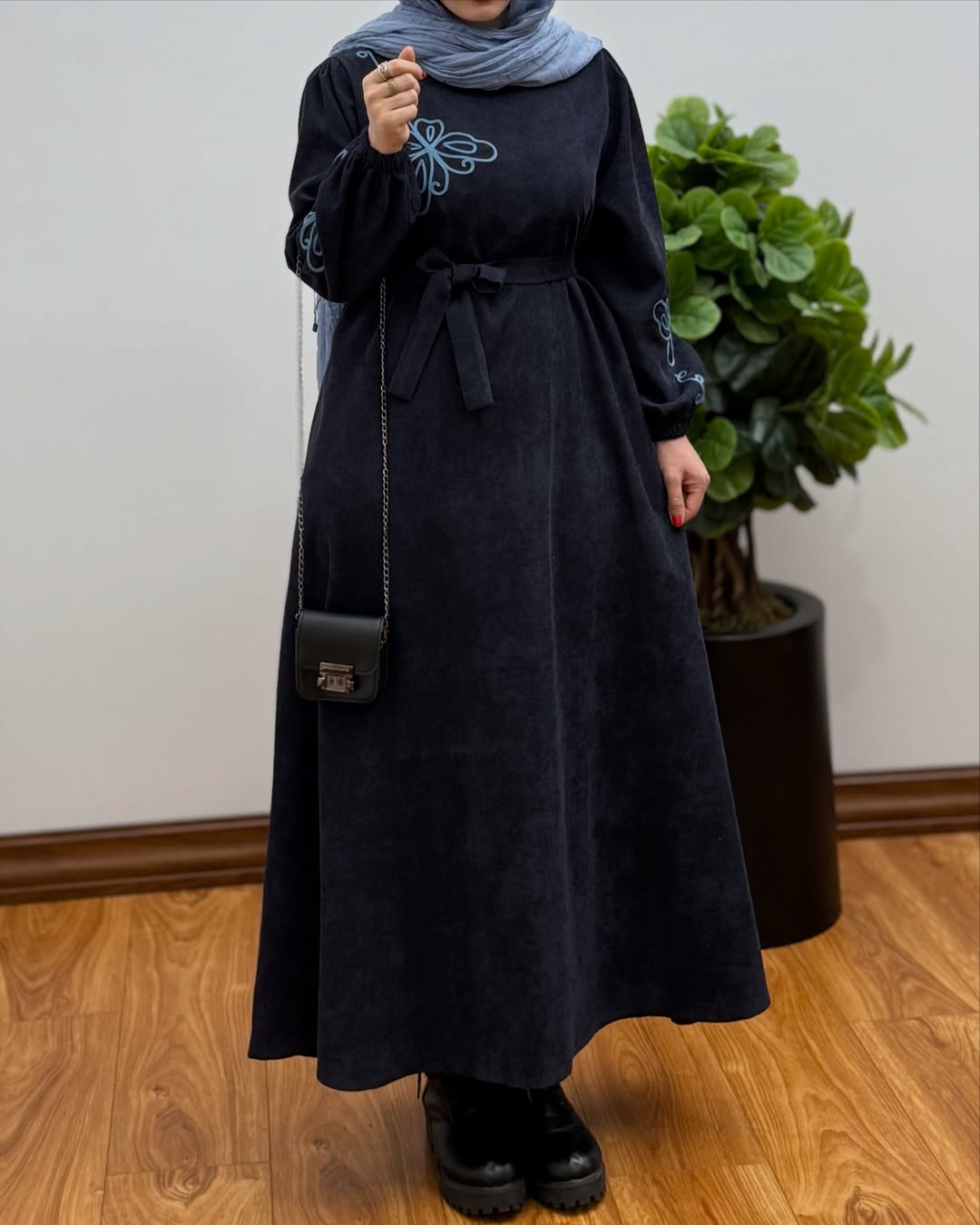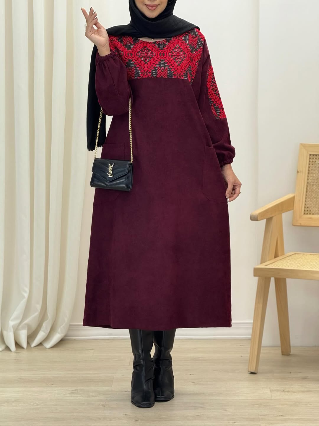 ناموجودپیراهن مانتویی زنانه مخمل کبریتی طرح گلدوزی گندم